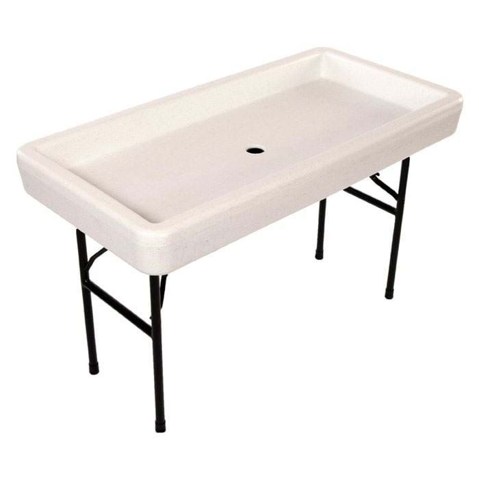 Table glacière de service creuse blanche pour la remplir de glace et pouvoir y servir vos breuvages froids ou bouchées. Remplissez simplement la table de 50 livres de glace et déposez-y vos breuvages et nourriture. Peut supporter jusqu'à un poids de 350 livres. Deux bouchons au fond permettent de vider l'eau facilement par la suite. Aussi disponible en noir.