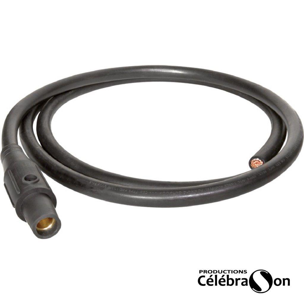 Câble d'alimentation électrique avec connecteur Camlock femelle série 16 de couleur noir nommé «tail». Sert à installer une connexion temporaire au panneau électrtique principal des lieux pour alimenter un panneau électrique portatif temporaire disponible en sus (voir distro ou distribution électrique).