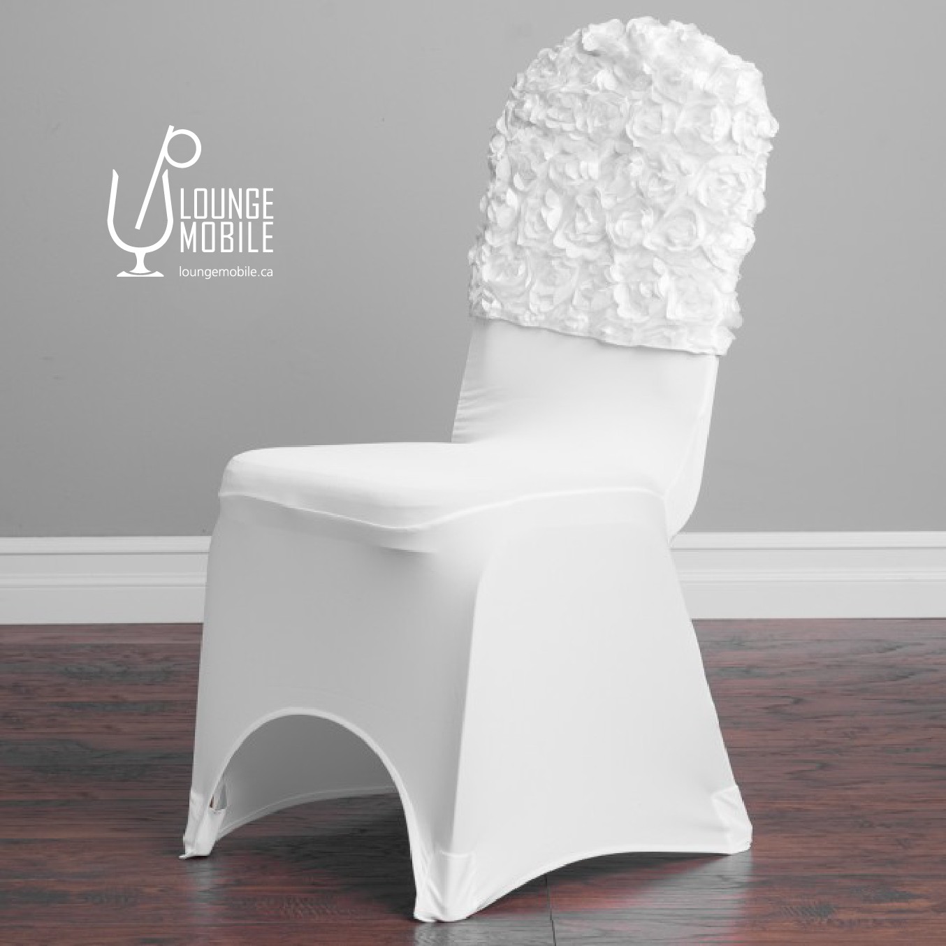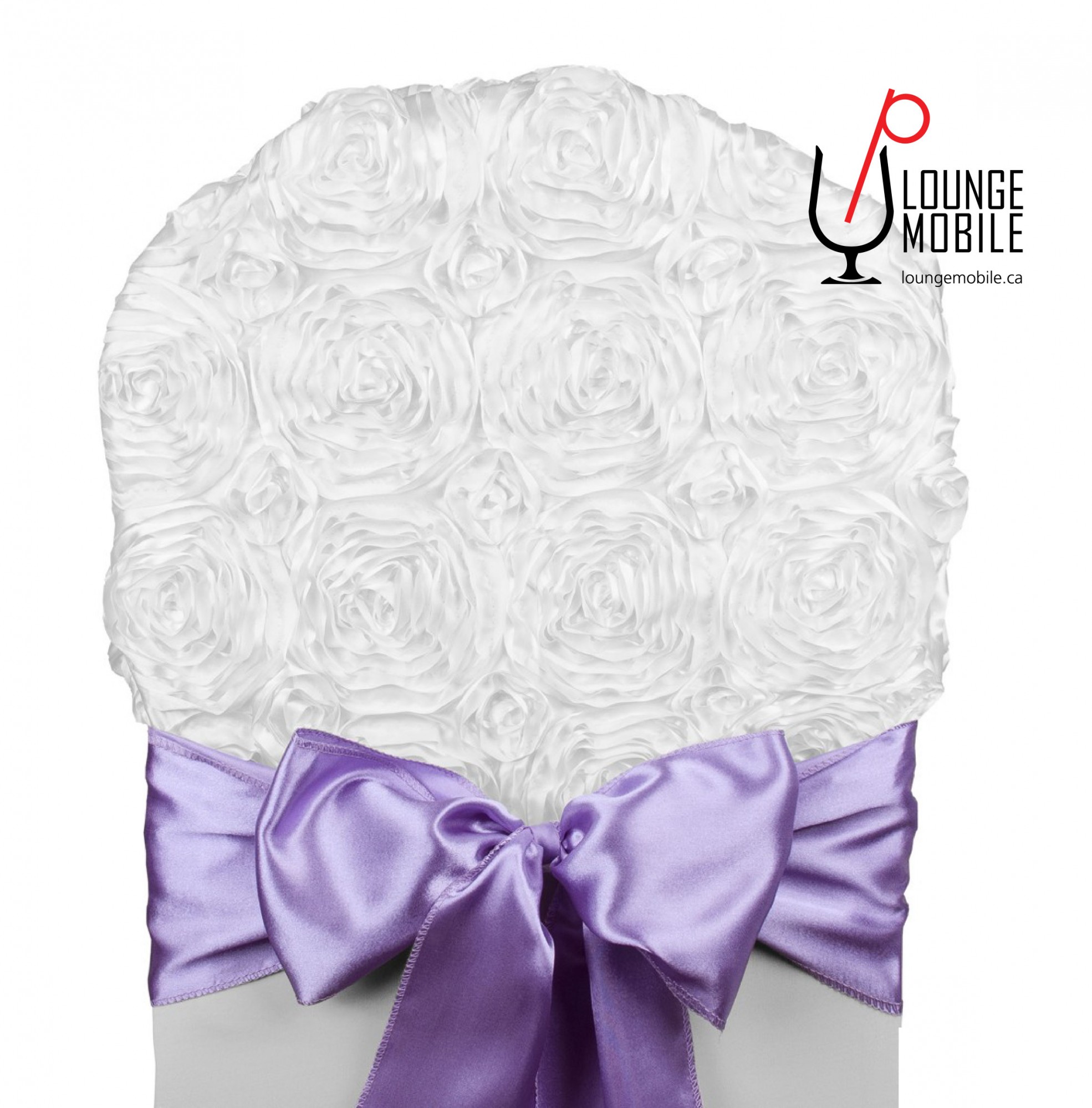 Capuchon de chaise blanc avec motifs en rosettes 3d pour donner la touche d'élégence à votre décoration. Le complément idéal aux housses de spandex / lycra. Compatible seulement avec les chaises de banquet (dossiers ronds ou carrés). Dimensions idéales du dossier 37'' X 16''. Disponibles en plusieurs couleurs.