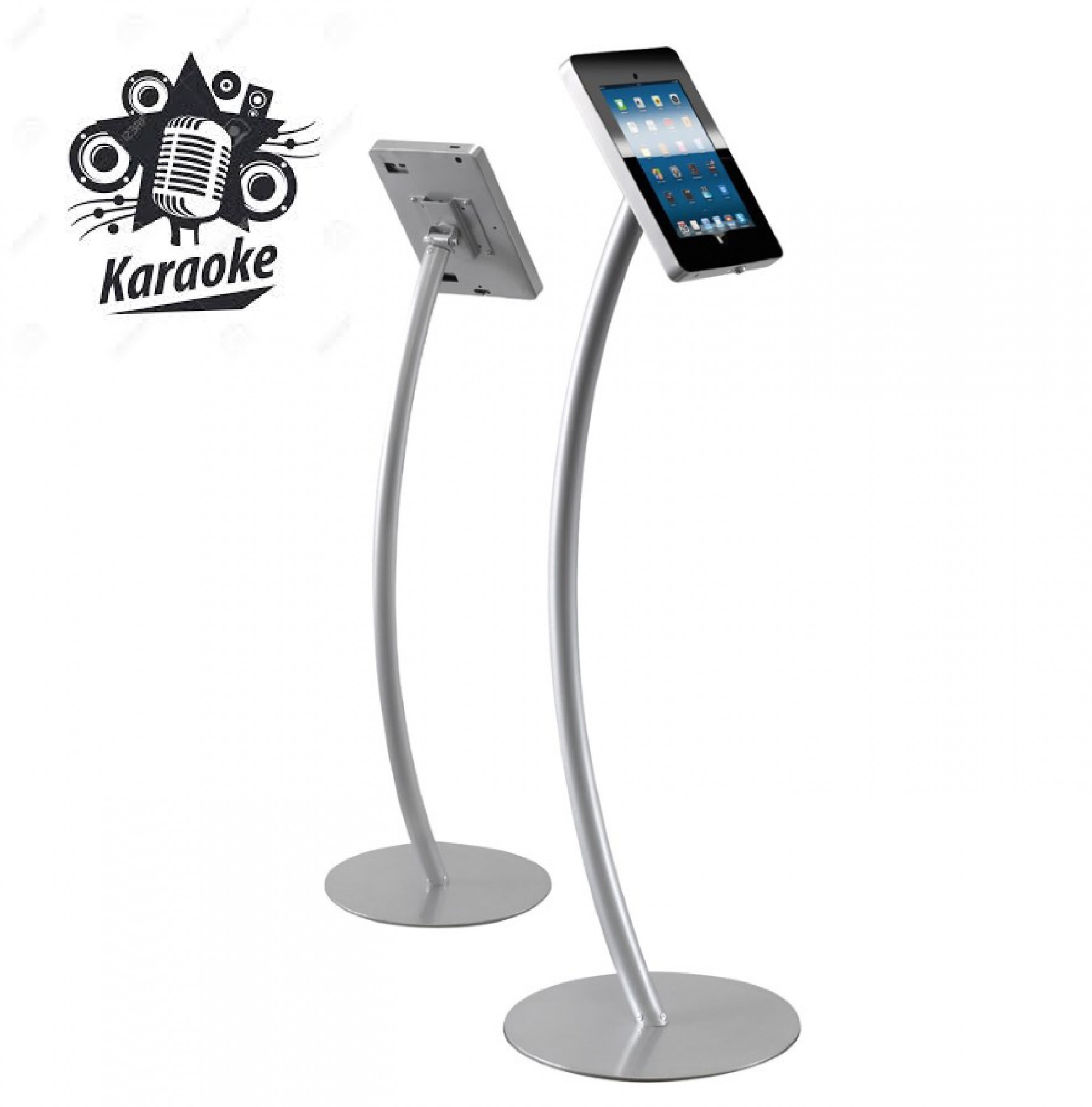 Station de karaoké portative et mobile sur pied facile d'utilisation. Forme pour emporter économique. Les gens naviguent sur la tablette tactile pour chercher leur chanson désirée. Ils peuvent ensuite chanter en regardant les paroles à l'écran. Un câble audio 1/8 vous permet de relier la tablette à votre propre système de son maison pour y diffuser toutes les chansons désirées. Aucun micro d'inclus avec ce forfait. Pour une formule plus complète, choissisez le produit KARAOKÉ MOBILE SUR PIED AVEC MICRO ET CAISSE DE SON.