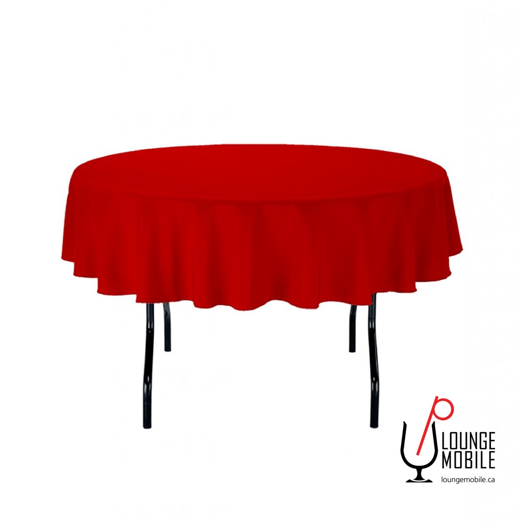 Nappe ronde en polyester de couleur rouge mesurant 70''. Idéal pour une table de 4' de large afin d'avoir un dépassement de la nappe de 11'' sous la table semblable à l'illustration principale. Aussi très utile pour les tables à cocktail hautes de type «trolleuses».