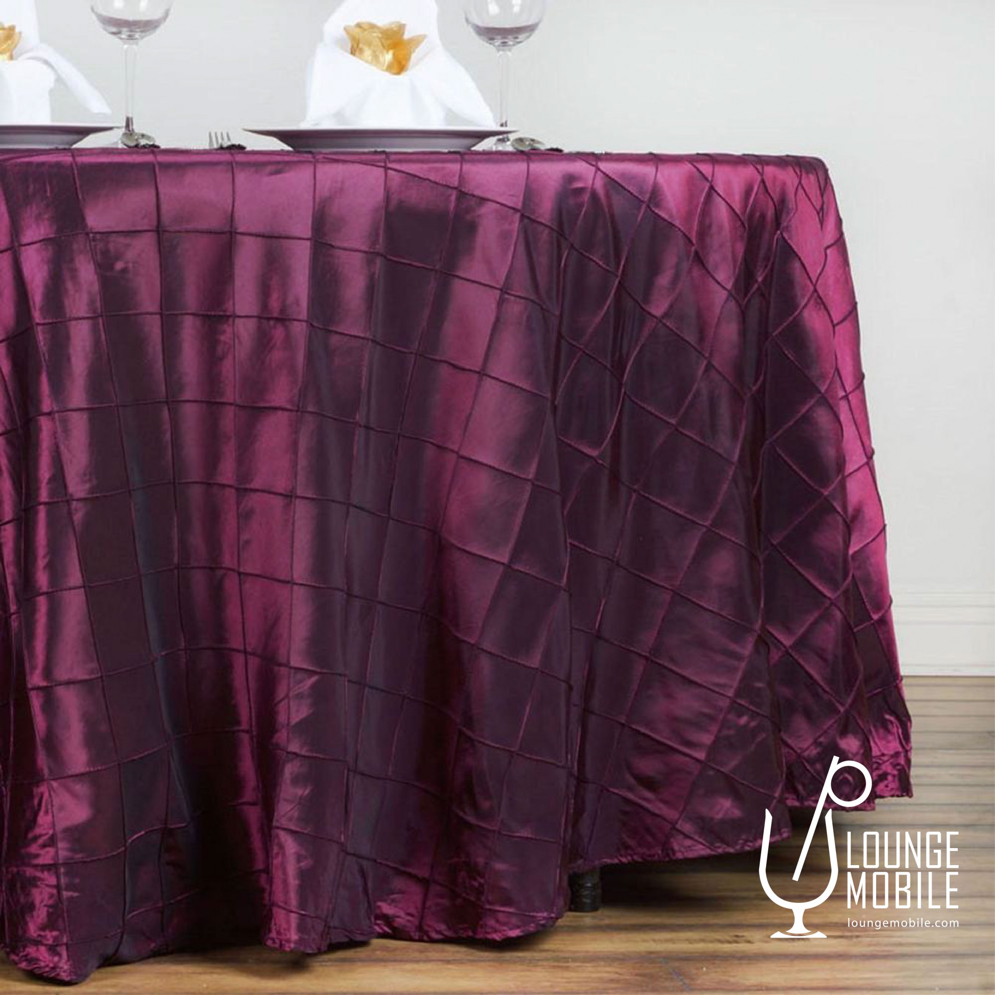 Nappe ronde en taffeta de 132'' de diamètre de couleur bourgogne aux motifs carrelés avec relief. Idéal pour une table de 6' de large afin d'avoir une chute au sol parfaite semblable à l'illustration principale. Aussi disponible en d'autres choix de grandeurs, tissus et couleurs en inventaire et sur commande.
