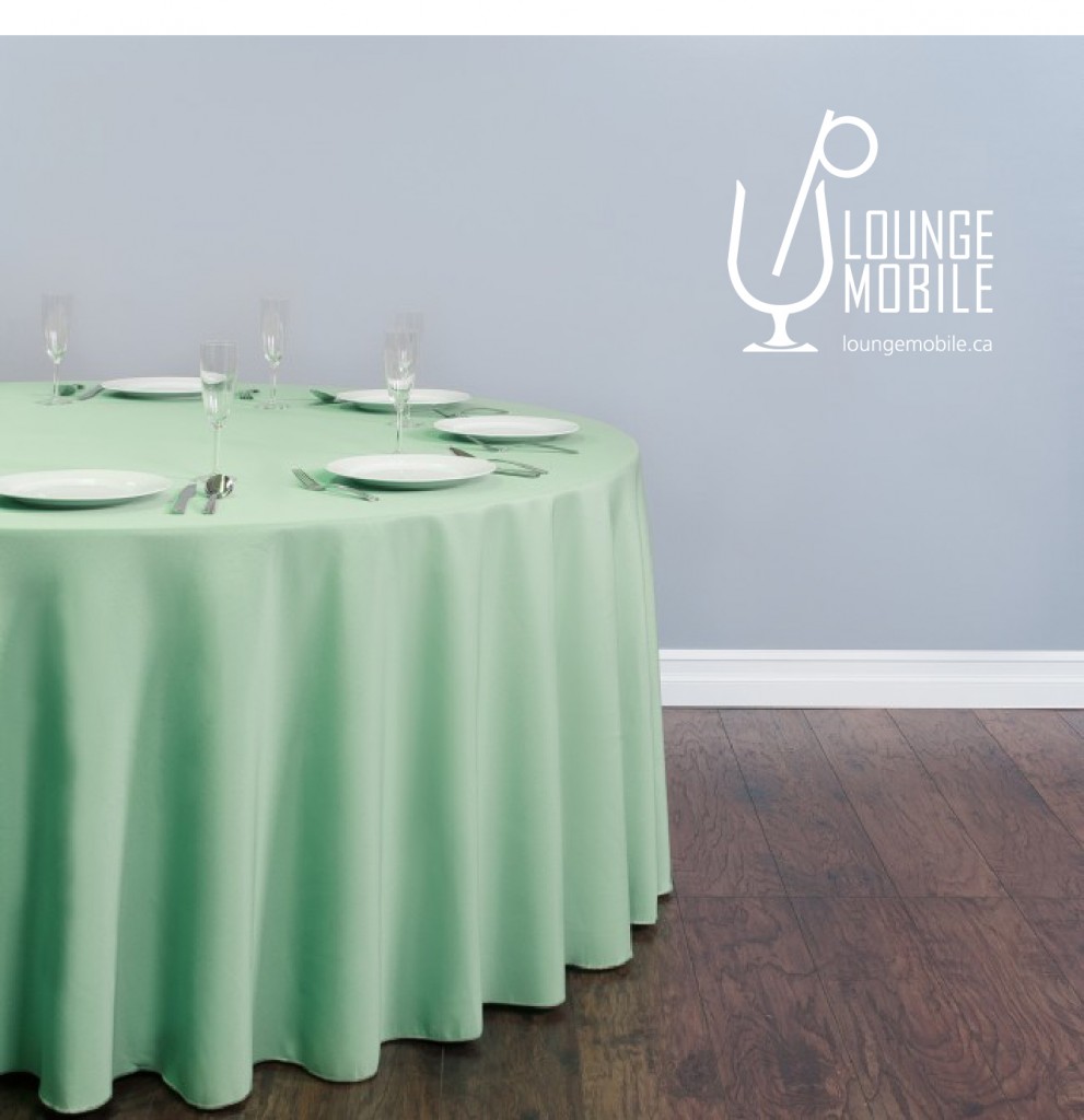 Nappe ronde en polyester de couleur Vert bleu Hemlock mesurant 132''. Idéal pour une table de 6' de large afin d'avoir une chute au sol parfaite semblable à l'illustration principale. Aussi disponible en d'autres choix de grandeurs, tissus et couleurs en inventaire et sur commande.