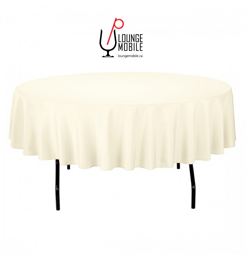Nappe ronde en polyester de couleur ivoire mesurant 90''. Idéal pour une table de 5' de large afin d'avoir une chute à 15'' du sol semblable à l'illustration principale. Aussi très utile pour les tables à cocktail hautes de type «trolleuses». Disponible en d'autres choix de grandeurs, tissus et couleurs et inventaire et sur commande.